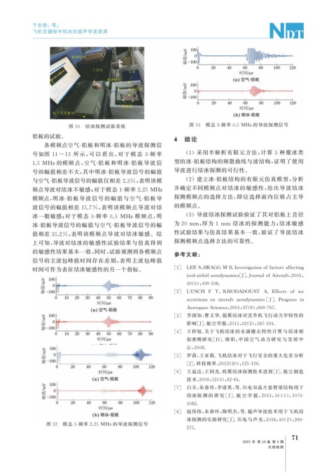 冰 - 铝板导波信号的幅值与空气 - 铝板导波信号的幅 为 20mm , 厚为 1 mm 结冰的探测能力; 结冰敏感