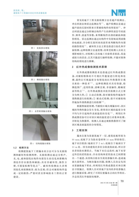 便、 可重复检 测 等 优 点 [ 6 ] 。 破 坏 性 检 测 法 大 多 利 水泵抽取地下积水, 再利用红外热成像技术和目测