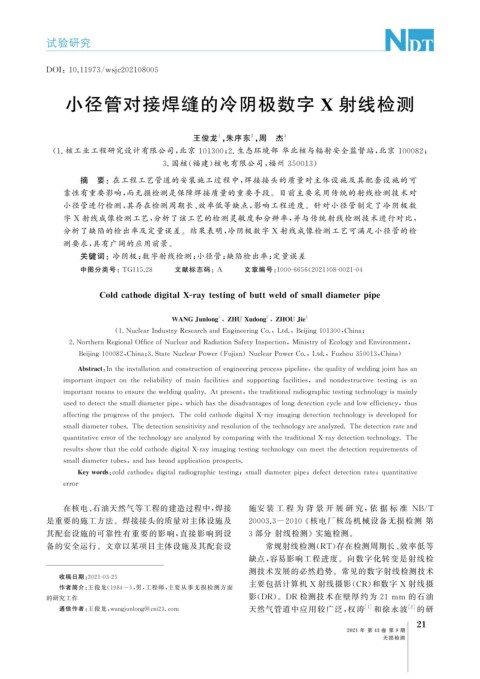 Ke ywords : coldcathode ; di g italradio g ra p hictestin g ; smalldiameterp i p e ; defectdetectionrate ; q uantitative