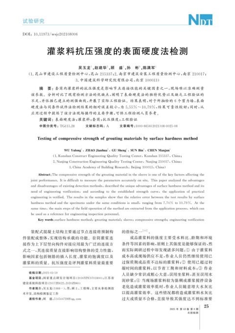 关键词:表面硬度法; 灌浆料; 套筒; 抗压强度; 工程验证