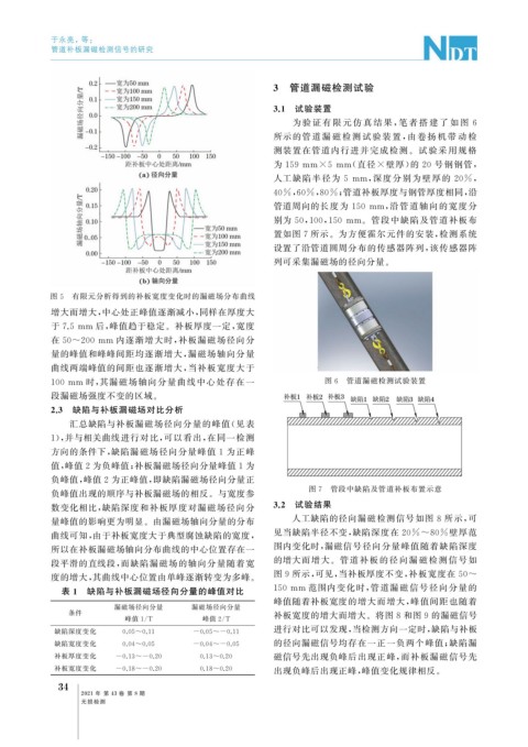 表 1 缺陷与补板漏磁场径向分量的峰值对比 150mm 范围内变化时, 管道漏磁信号径向分量的