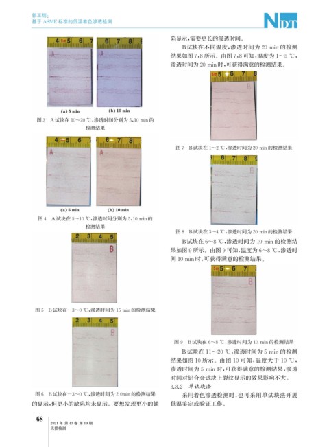 图6 B试块在-3~0℃ , 渗透时间为20min的检测结果 采用着色渗透检测时, 也可采用单试块法开展