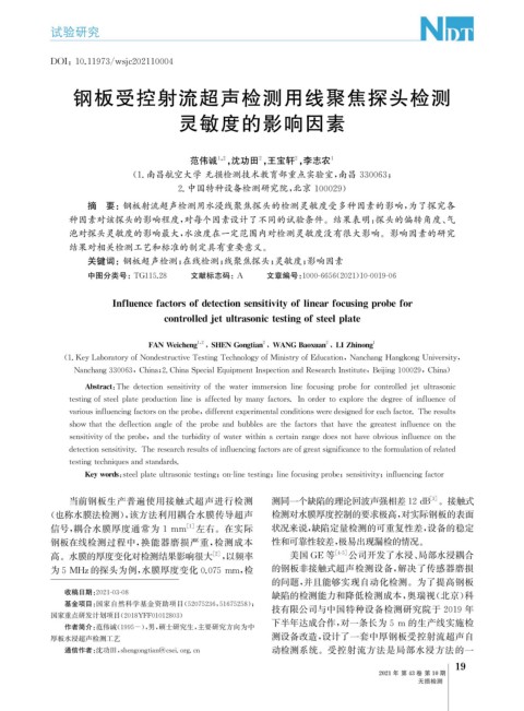 Ke ywords : steel p lateultrasonictestin g ; on-linetestin g ; linefocusin gp robe ; sensitivit y ; influencin g factor