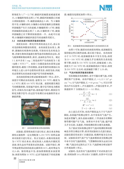 32.6dB 。保持增益不变, 添加铁锈粉使水浊度增 试验时, 先在没有气泡的情况下对试块进行扫