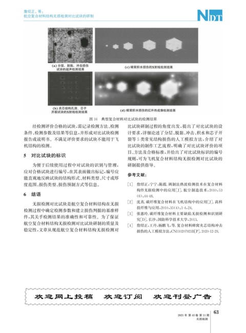 条件、 检测参数及结果等信息, 并形成对比试块检测 计要求, 详细论述了分层、 脱黏、 冲击、 积水和芯子开