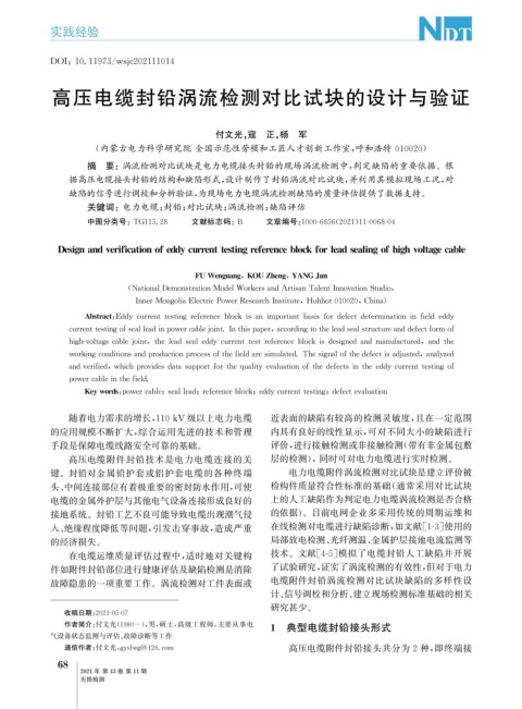 关键词: 电力电缆; 封铅; 对比试块; 涡流检测; 缺陷评估