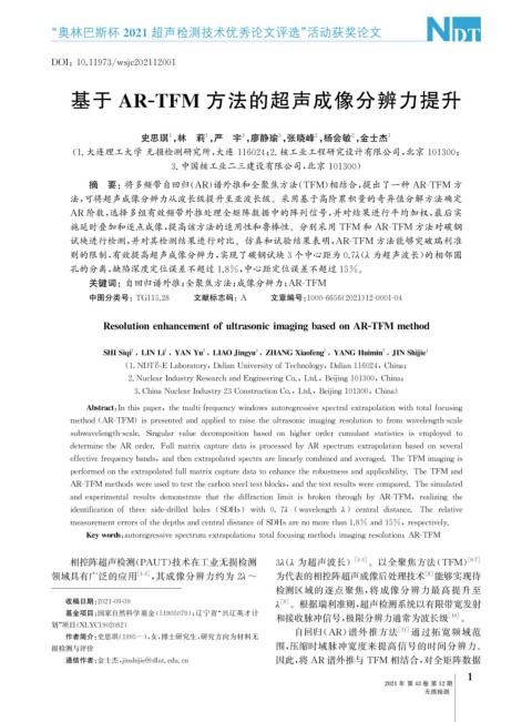 关键词: 自回归谱外推; 全聚焦方法; 成像分辨力; AR-TFM