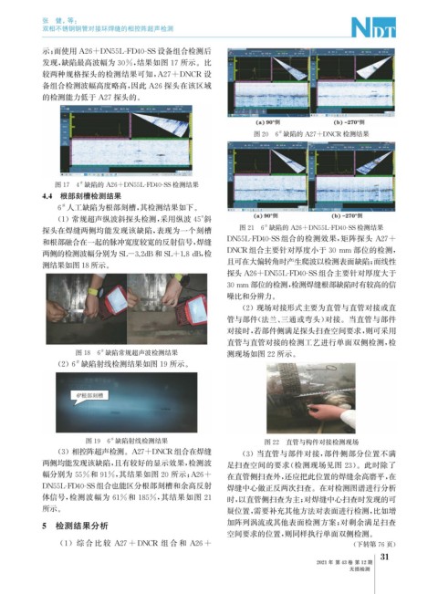 两侧均能发现该缺陷, 且有较好的显示效果, 检测波 足扫查空间的要求( 检测现场见图 23 )。此时除了