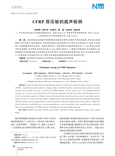 关键词: 复合材料; 双晶探头; 超声检测; 分层缺陷; 近表面缺陷