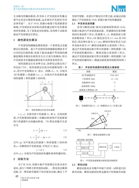 够定位损伤源。基于声发射的结构健康监测技术可 通过声发射波速试验计算出传感器1到传感器2的