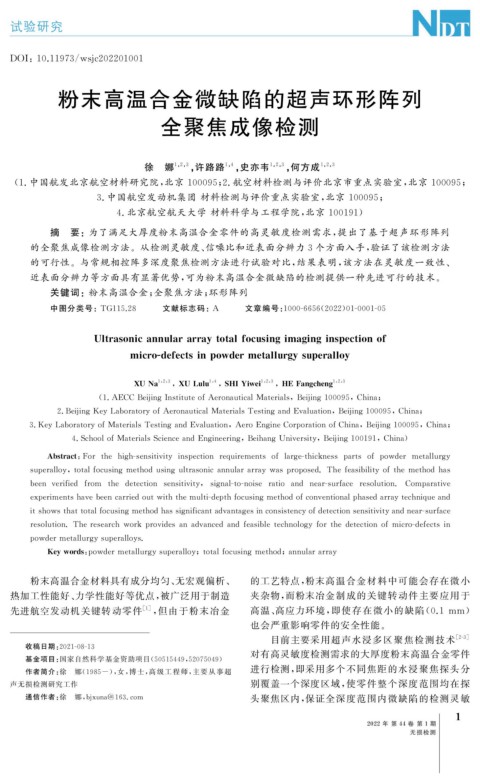 关键词:粉末高温合金; 全聚焦方法; 环形阵列