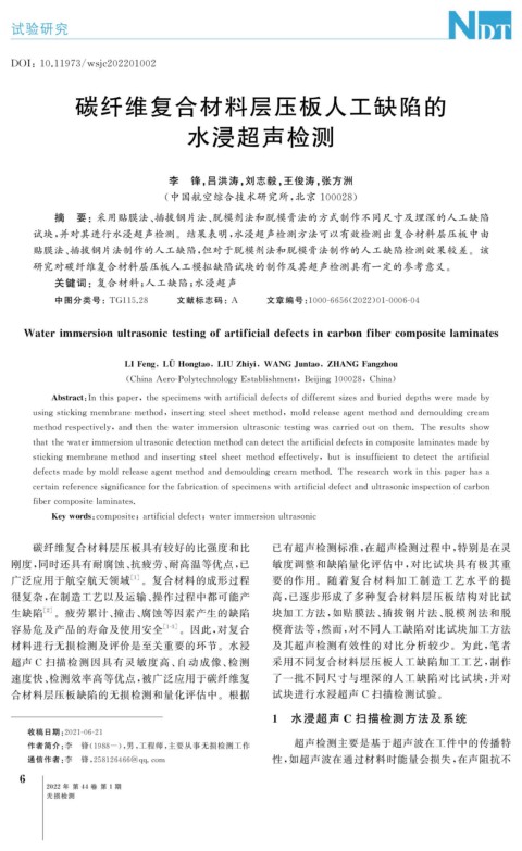 材料进行无损检测及评价是至关重要的环节。水浸 及其超声检测有效性的对比分析较少。为此, 笔者