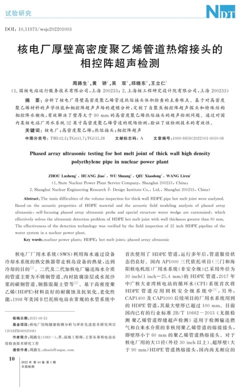 关键词:核电厂; 高密度聚乙烯; 热熔接头; 相控阵超声