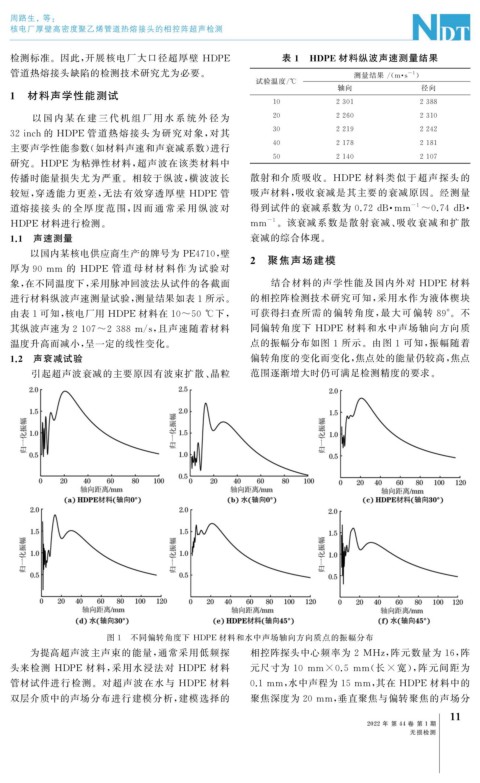 检测标准。因此, 开展核电厂大口径超厚壁 HDPE 表 1 HDPE 材料纵波声速测量结果