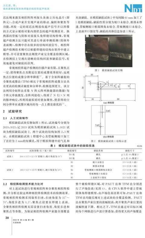阵元), 合成声束并实现声束的移动、 偏转和聚焦等 5处模拟缺陷, 缺陷性质分别为坡口未熔合、 根部未焊