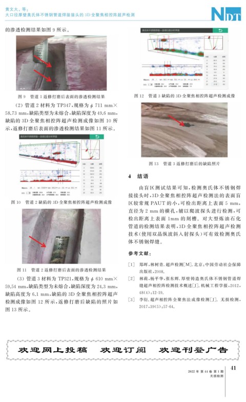 检测成像如图 12 所示, 返修打磨后缺陷的 照片如 [ 3 ] 李衍 . 超声相控阵 全 聚 焦 法 成 像 检 测[ J ] .无 损 检 测,