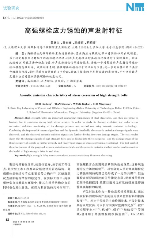 关键词:高强螺栓; 应力锈蚀; 声发射; K 均值聚类