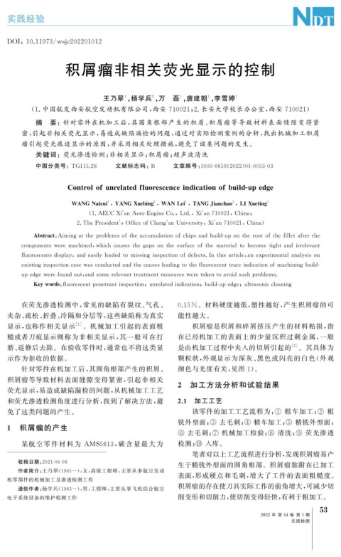 关键词:荧光渗透检测; 非相关显示; 积屑瘤; 超声波清洗