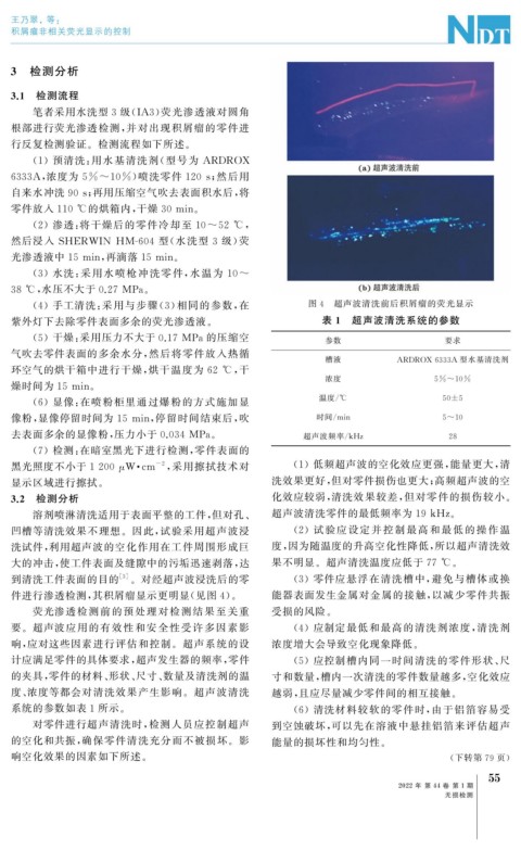 紫外灯下去除零件表面多余的荧光渗透液。 表 1 超声波清洗系统的参数
