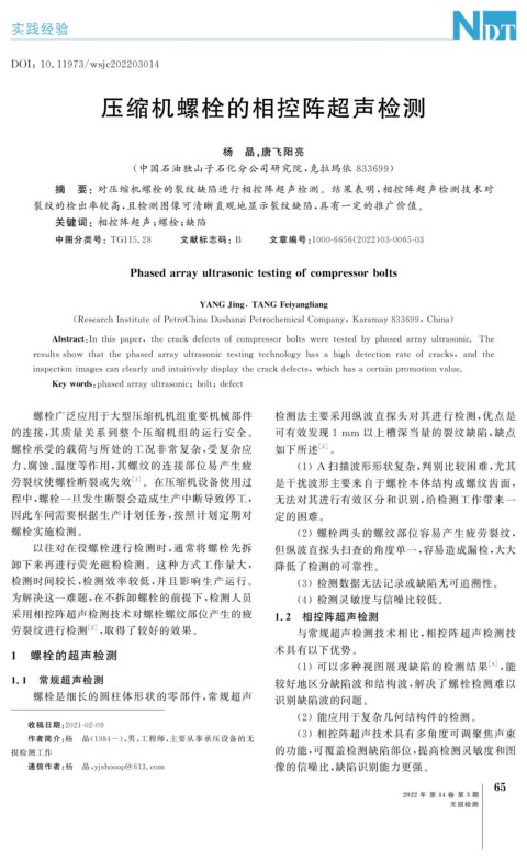 摘 要:对压缩机螺栓的裂纹缺陷进行相控阵超声检测。结果表明, 相控阵超声检测技术对