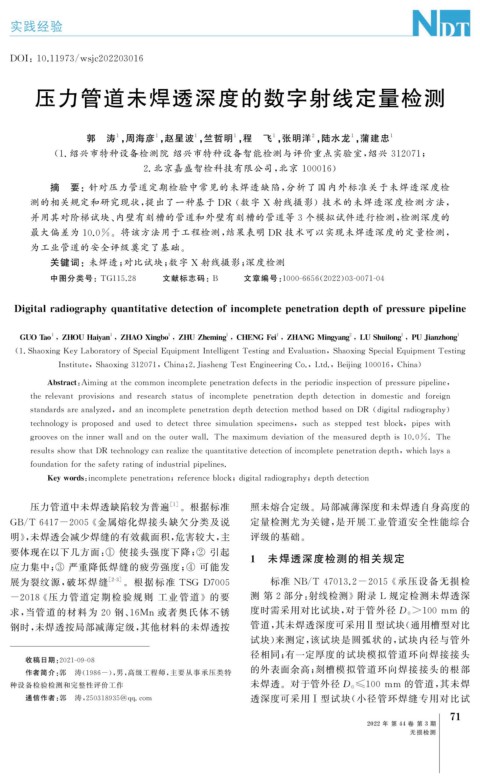 关键词:未焊透; 对比试块; 数字 X 射线摄影; 深度检测