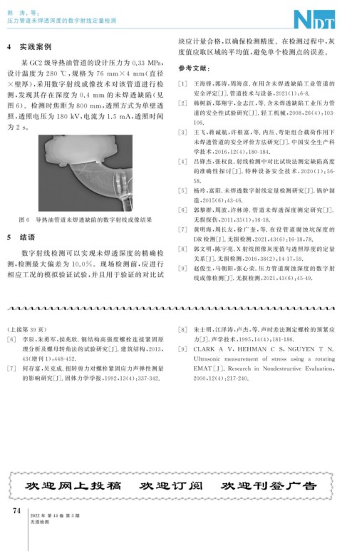 × 壁厚), 采用数字射线成像技术对该管道进行检 [ 1 ] 王海锋, 郭涛, 周海彦 . 在用含未焊透缺陷工业管道的