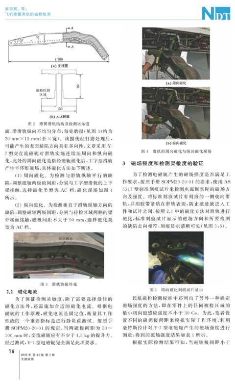缺陷, 调整磁轭两极间距, 分别与待检区域两侧的梁 件和试片之间, 按照 2.1 中的磁化方法对滑轨进行