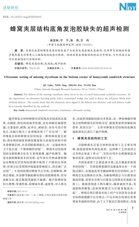 关键词:蜂窝夹层结构; 发泡胶; 超声检测