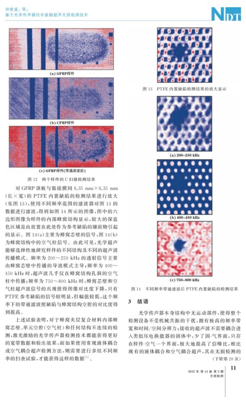 气柱超声波信号的出现使得图像对比度下降, 只有 图 14 不同频率带通滤波后 PTFE 内置缺陷的检测结果