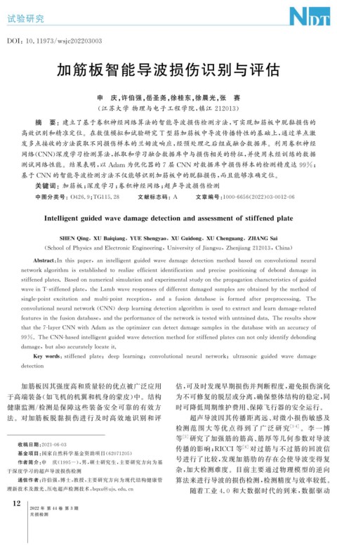 摘 要:建立了基于卷积神经网络算法的智能导波损伤检测方法, 可实现加筋板中脱黏损伤的
