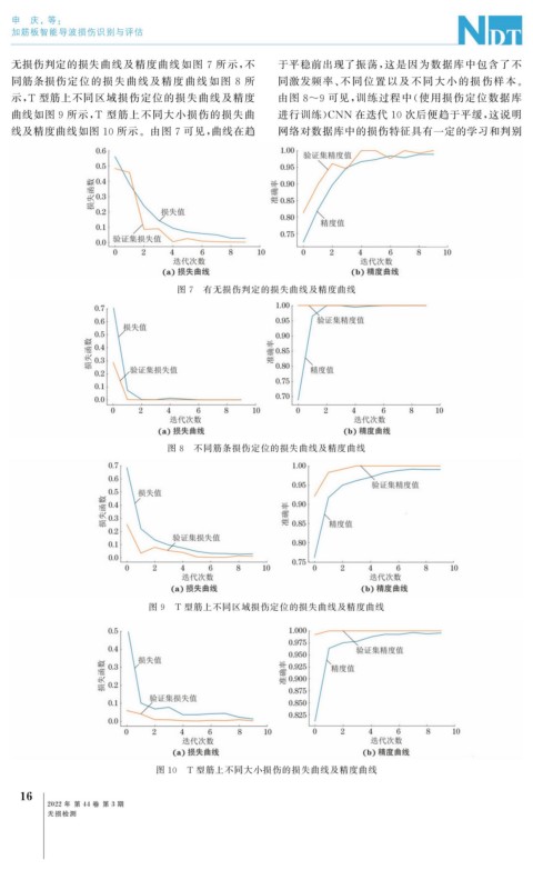 线及精度曲线如图 10 所示。由图 7 可见, 曲线在趋 网络对数据库中的损伤特征具有一定的学习和判别