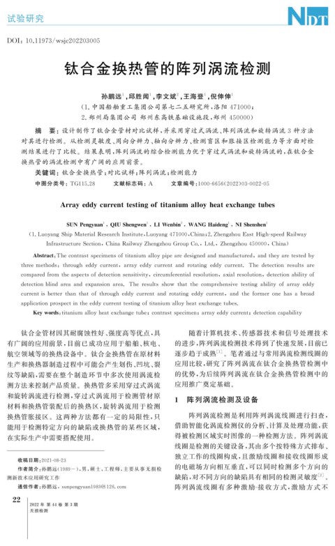 关键词:钛合金换热管; 对比试样; 阵列涡流; 检测能力