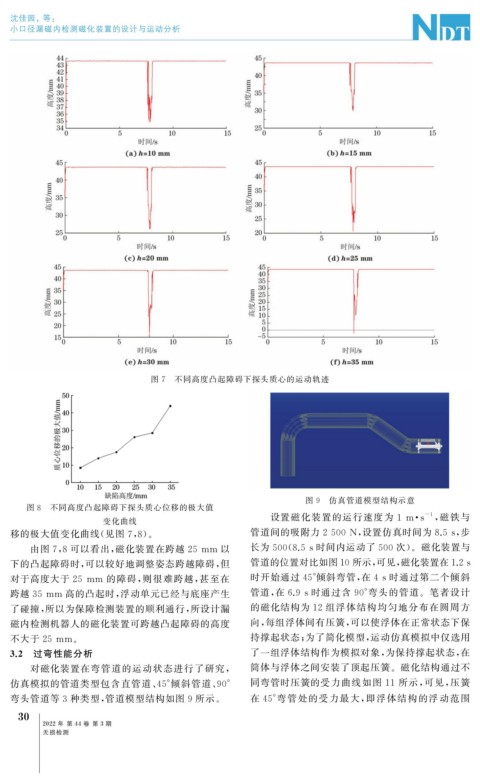 跨越 35mm 高的凸起时, 浮动单元已经与底座产生 管道, 在 6.9s时通过含 90° 弯头的管道。笔者设计