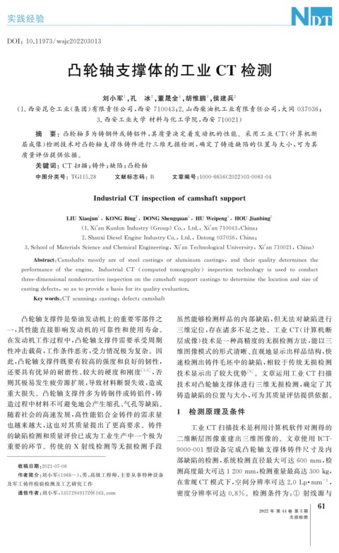 在发动机工作过程中, 凸轮轴支撑件需要承受周期 层成像) 技术是一种高精度的无损检测方法, 能以三
