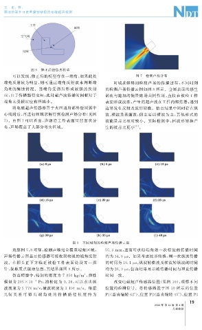 声场传播云图显示传感器可接收到较强的端角反射 约为34.6 μ s 。如果考虑波形转换, 则一次纵波传播