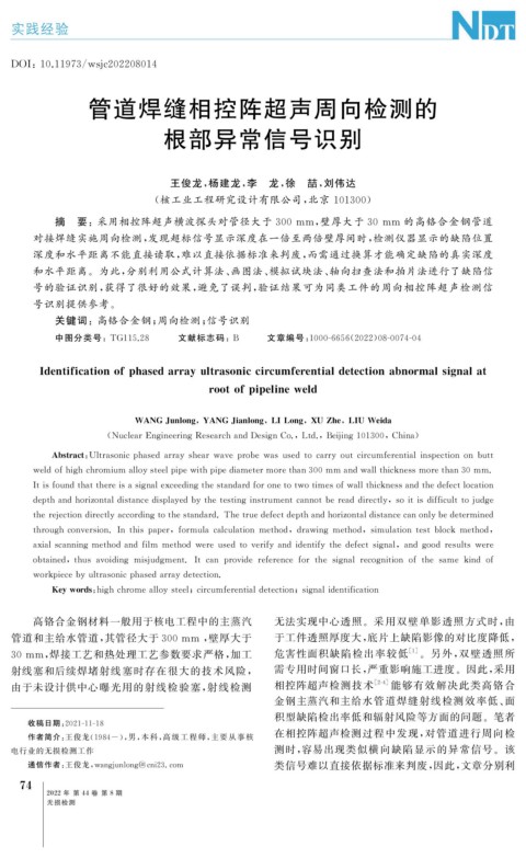 作者简介: 王俊龙( 1984- ), 男, 本科, 高级工程师, 主要从事核 在相控阵超声检测过程中发现, 对管道进行周向检