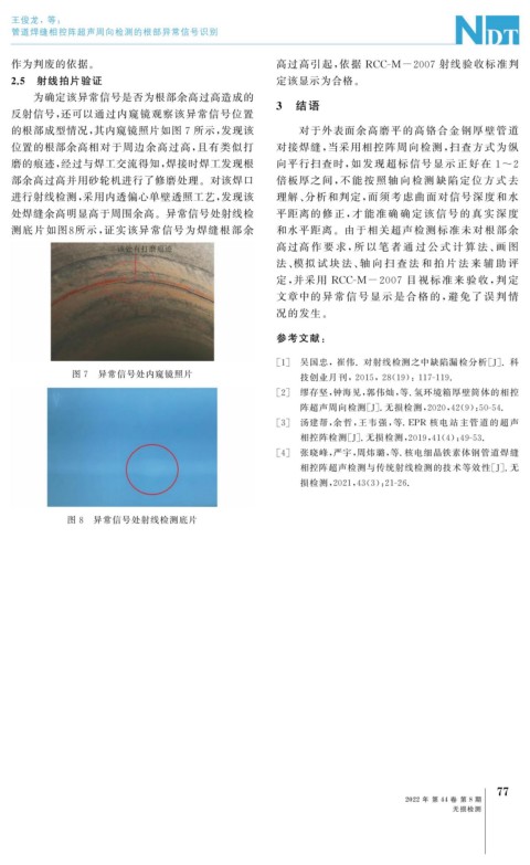 测底片如图 8 所示, 证实该异常信号为焊缝根部余 和水平距离。由于相关超声检测标准未对根部余
