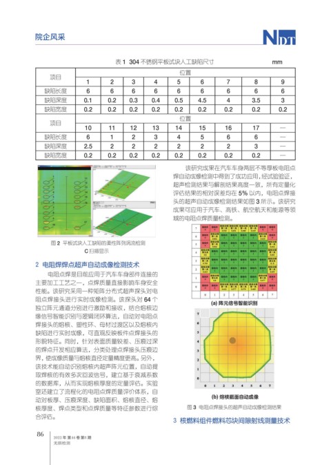 核厚度、焊点类型和点焊质量等特征参数进行综 图 3 电阻点焊接头的超声自动成像检测结果
