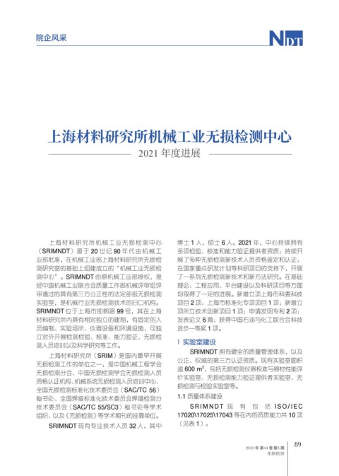 测中心”。SRIMNDT 由原机械工业部授权,是 了一系列无损检测新技术和新方法研究。在基础