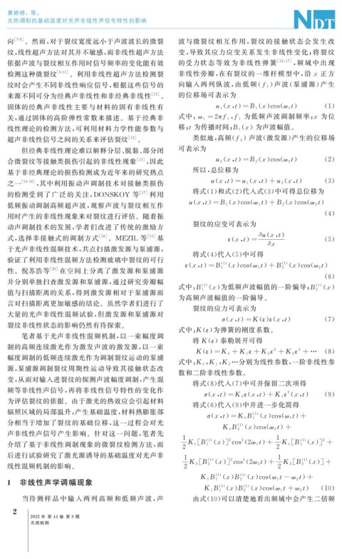 合微裂纹等接触类损伤引起的非线性现象 [ 13 ] , 因此 u 2 x , t ) B 2 x ) cos ( ω 2 t ) ( 2 )