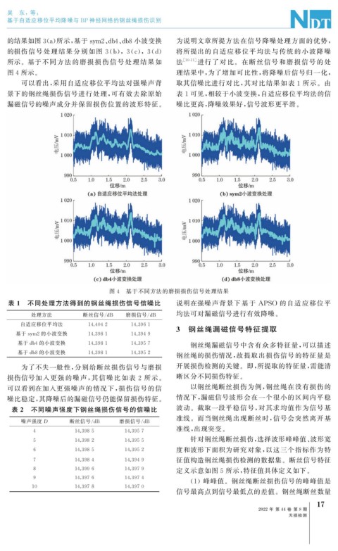 表 1 不同处理方法得到的钢丝绳损伤信号信噪比 说明在强噪声背景下基于 APSO 的自适应移位平