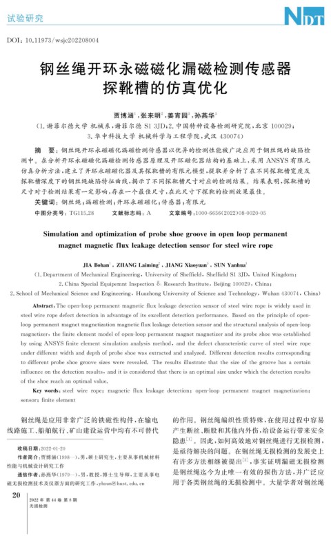 关键词:钢丝绳; 漏磁检测; 开环永磁磁化; 传感器; 有限元