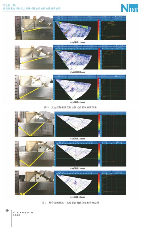 王业民,等: 奥氏体复合材料压力容器对接接头的相控阵超声检测 图 8 复合层侧横波直射法测试位置和检测结果 图 9 复合层侧横波一次反射法测试位置和检测结果 4 0 2022 年 第 44 卷 第 8 期 无损检测