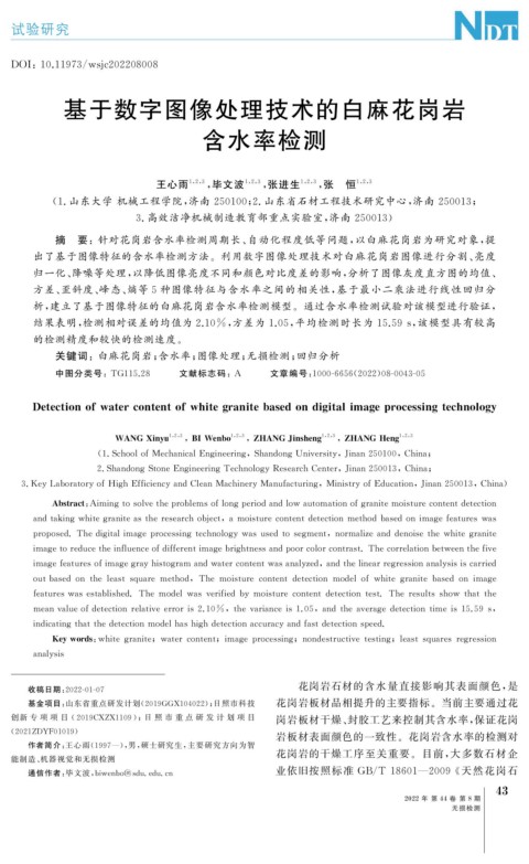 关键词:白麻花岗岩; 含水率; 图像处理; 无损检测; 回归分析