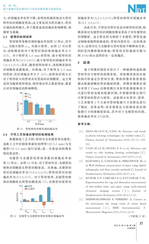 大, 识别偏差率有所下降, 表明该检测系统对大管径 别偏差率为( 2.2±1.9 ) % ; 焊管的壁厚识别偏差率
