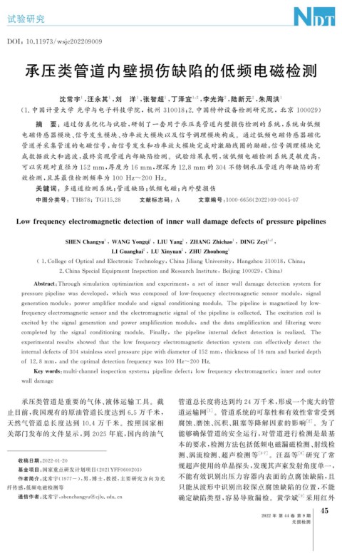 关键词:多通道检测系统; 管道缺陷; 低频电磁; 内外壁损伤