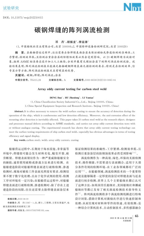 关键词:碳钢; 焊缝; 阵列涡流; 涂层