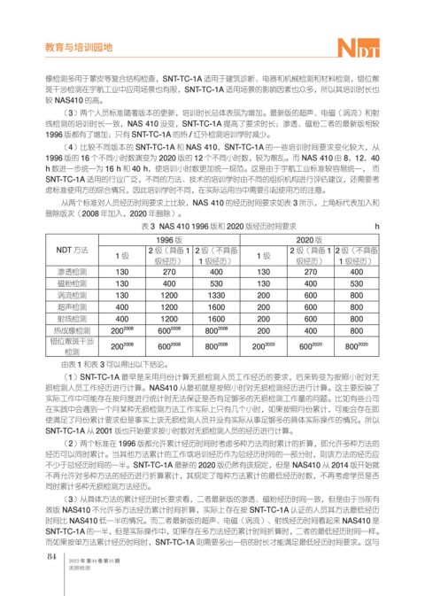 线检测的培训时长一致,NAS 410 没变,SNT-TC-1A 提高了要求时长;渗透、磁粉二者的最新版相较