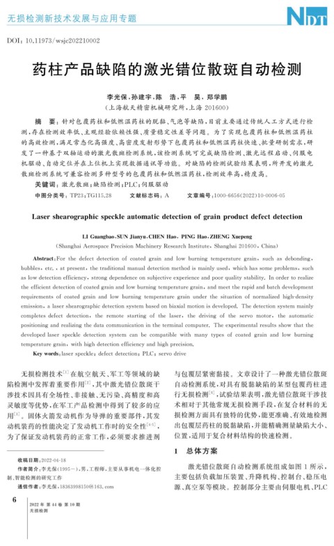 发了一种基于双轴运动的激光散斑检测系统, 该检测系统可完成缺陷检测、 激光远程启动、 伺服电