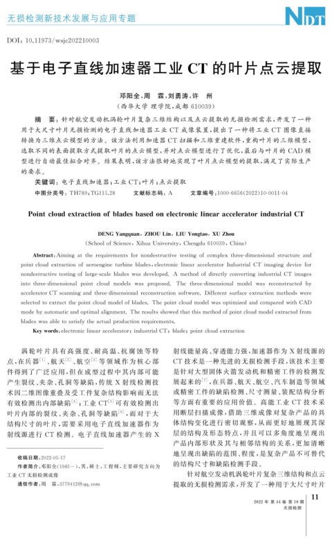 关键词:电子直线加速器; 工业 CT ; 叶片; 点云提取